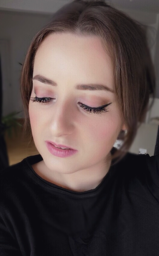 Un fard roz aplicat discret pe pleoape, o nuanta de maro in pliul ochiului si un eyeliner negru …..si e gata machiajul ochilor. Eventual puteti accentua privirea cu mascara si cateva manunchiuri de gene false, asa cum am facut eu. Pe buze am folosit un ruj roz mat, iar pe obraji am folosit fardul roz (acelasi folosit si pe pleoape).